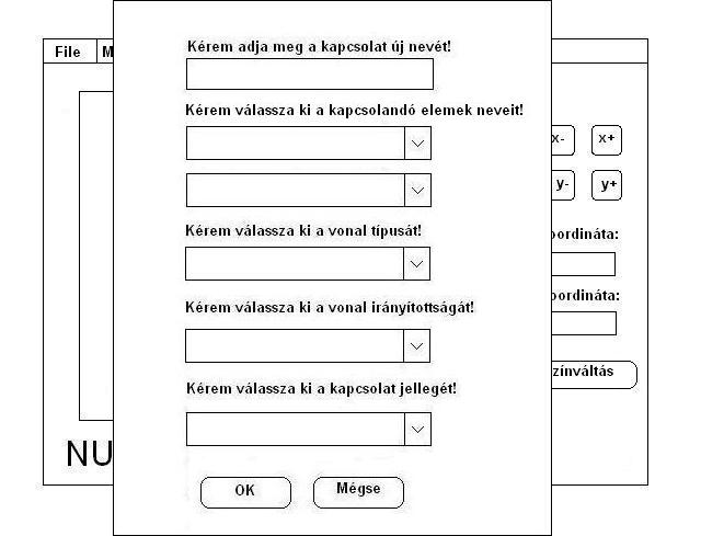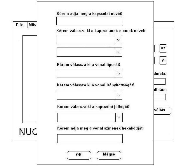 Ennek az ablaknak a mezőiben megváltoztathatja akiválsztott kapcsolat tulajdonságai. A nevét, azt, hogy mely egyedek között legyen berajzolva, a vonal típusát, illetve irányítottságát, valamint a kapcsolat jellegét. Abban az esetben, ha valamelyik mezőt nem tölti ki, akkor az annak a mezőnek megfelelő tulajdonság változatlan marad.