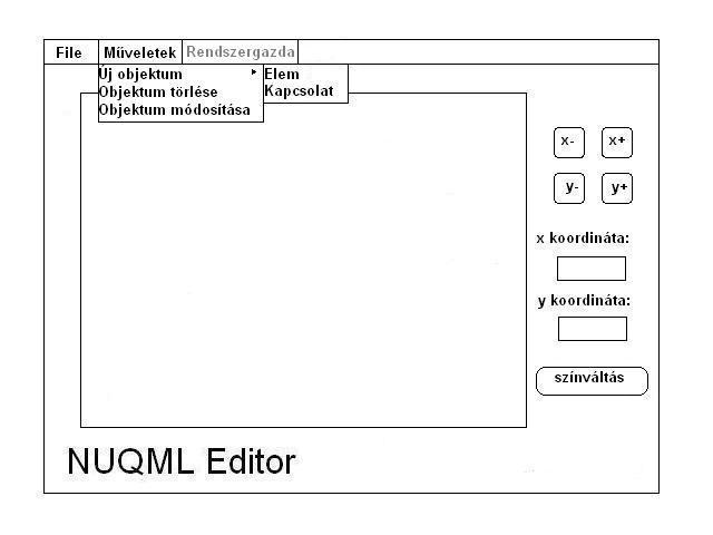 A főablak felső soránban található a menü, ahol böngészhet a különböző funkciók között. Középen találja a szerkesztő felületet, jobbra pedig a szerkesztőeszközöket. Az újonnan létrehozott objektumok megjelennek a szerkesztőfelületen. A szerkesztőfelülettől jobbra elhelyezkedő "x+", "x-", "y+", "y-" gombok segítségével változtathatja meg egy kiválasztott egyed pozícióját a szerkesztő felületen. A program az esetlegesen egyedhez kötött kapcsolatokat automatikusan újrarajzolja. A pozíciót azonnal is megadhatja a kívánt koordináták megfelelő mezőkbe beírásával. A "színváltás" gomb egy ablakot nyit meg, ahol megváltoztathatja a kiválasztott rajzelem színét.